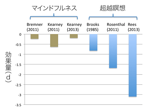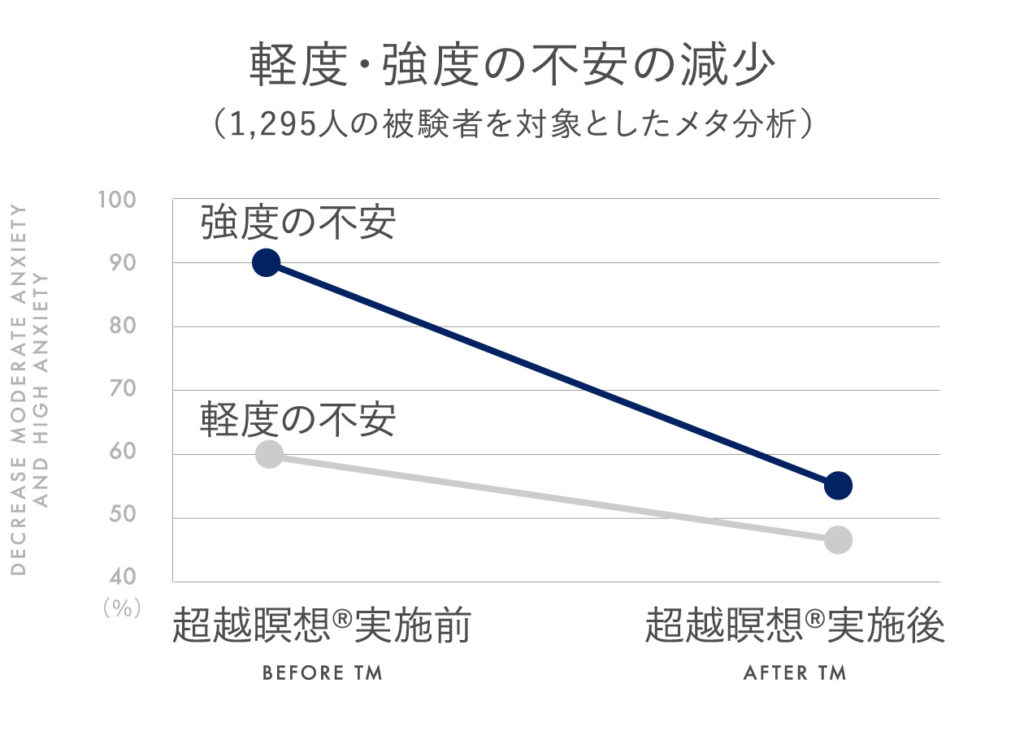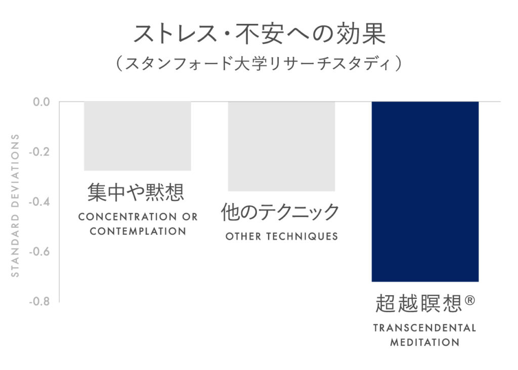 TMテクニックと他の瞑想法やリラックス法を比較研究した、スタンフォード大学での146件の科学的研究をメタ解析したところ、「不安感の減少」について2倍以上の効果があることが分かっています。