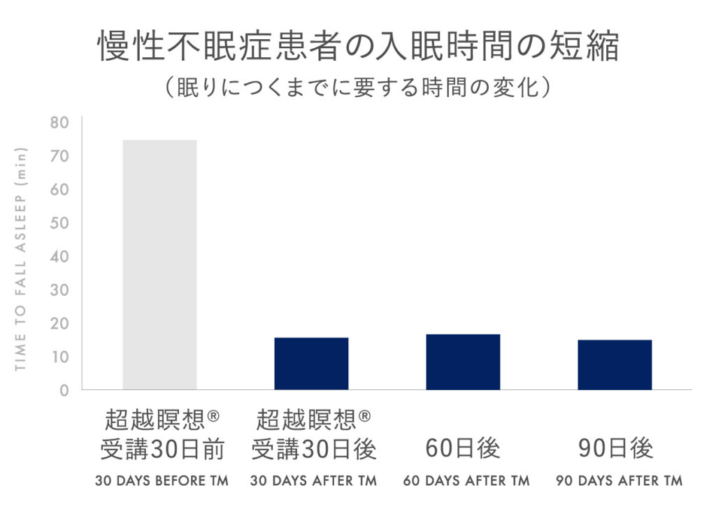 不眠症患者のグループがTMを始めた結果、眠りに就くまでの時間が大幅に短縮されました。TMは、簡単に学ぶことができ、その効果は即効性があり持続的な副作用のない不眠症セラピーである、と報告されています。