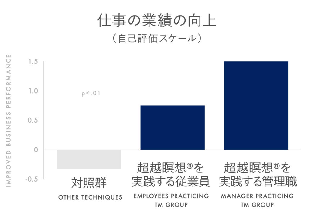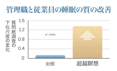 自動車産業の管理職および従業員を対象とした研究で、超越瞑想の規則的な実習を始めた従業員は、同じ職場の対照グループと比較して、睡眠の質が有意に改善しました(p<.0025)。最も顕著な効果を示したのはTMの実習を規則的に続けた従業員でした。
