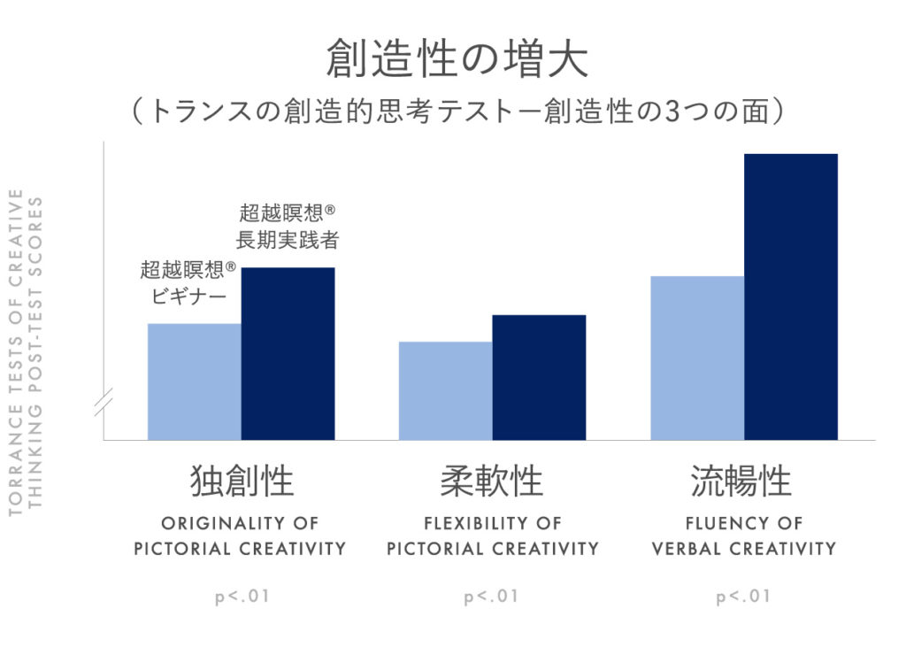 この研究は、絵画的創造性と言葉的創造性を測るトランス創造的思考テストを用いて、TMを学んだ人と対照群の創造性の度合いを調べたものです。TMを学んだ人は、5ヵ月間に、創造性の3つの基準、独創性、柔軟性、流暢さにおいて向上を示しました。