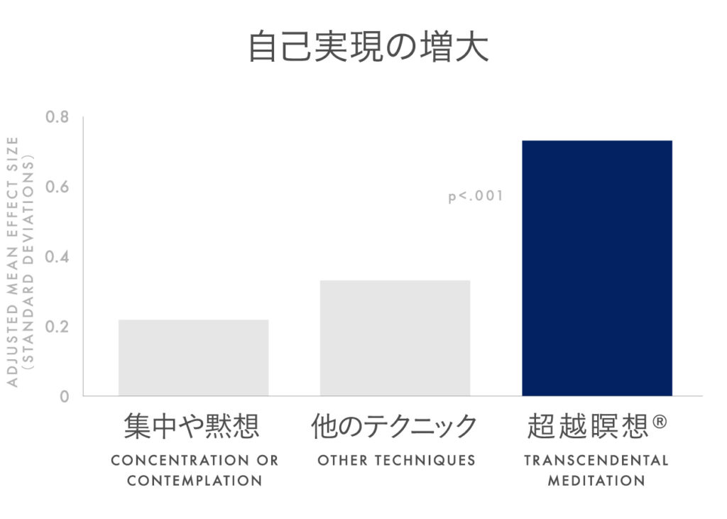 入手可能な研究(42の別々の結果)全てについて統計的メタ解析を行ったところ、TMは、自己実現の増大に関する効果が、他の瞑想法やリラックス法よりもはるかに大きいことが明らかになりました。自己実現とは、内なる潜在力を現実化し、人生のあらゆる領域で表現することです。それは、人格の統合と安定、自愛、情緒面の成熟、温かい人間関係を生む能力、挑戦に対する適応反応などに現れていきます。